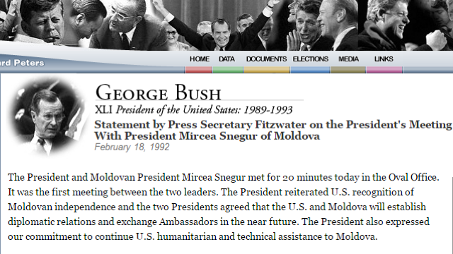 Конечно, бывают исключения, но Буш-старший, в отличие от своего сына, в откровенной глупости замечен не был. Затем Буш-старший, по воспоминаниям первого президента Молдовы, сердечно поприветствовал его, Снегура, после чего объявил о желании иметь дипломатические отношения с Молдовой.