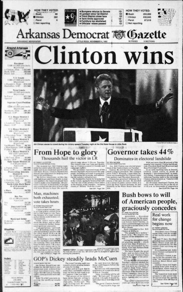Впрочем, многие считают, что победа демократа-Клинтона была столь убедительной лишь из-за третьего участника выборов, независимого кандидата Росса Перо. Он отбирал голоса избирателей, но не победил ни в одном штате, не получив голосов выборщиков, что, как принято считать в истории американской политологии, сыграло на руку именно Клинтону. Наиболее убедительной его победа оказалась в Федеральном округе Колумбия (почти 85%) и родном Арканзасе (53 процента).